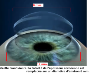 En cas de perte de transparence de la cornée (capot de l’oeil), il est nécessaire de réaliser une greffe de cornée qui consiste à remplacer la partie centrale par un greffon obtenu sur un donneur.